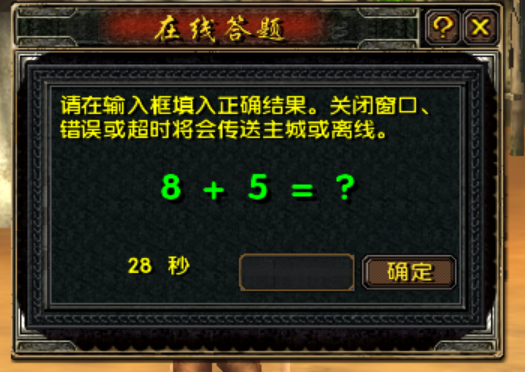 具体运行规则如下,系统如果怀疑当前非真人操作游戏,将会弹出简单的计算题,玩家需要在限定时间内完成作答,错误,超时或者关闭将被传送回主城,多次超时将被强制下线。